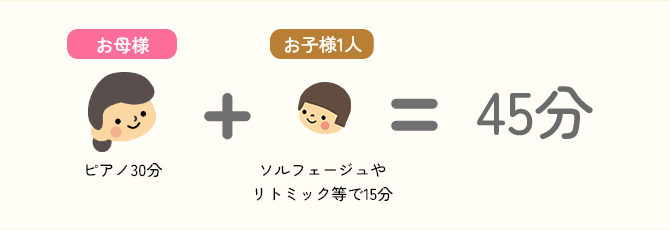 ※レッスンは原則、同じ時間・同じ曜日となります。 ※2 歳の場合は、習い事に馴染むべく、45 分レッスンがおすすめ。 ※ピアノ45 分以上のコースやヴァイオリン等をご希望の場合は、料金ページをご確認ください。 ※なお、ピアノ以外の楽器は、楽器の関係でお母様のレッスンとなります。