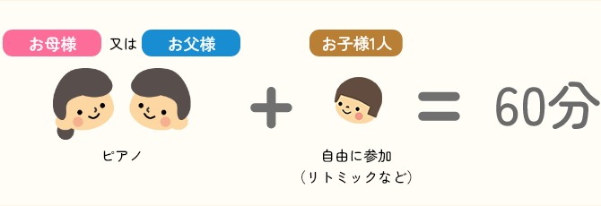 ※ レッスン(リトミックも含む)は、同時間、同曜日となります。 ※ヴァイオリンをご希望の場合は、料金ページで料金をご確認ください。 ※お子様3 歳以上の場合は、親子キッズ登録ページをご参照ください。